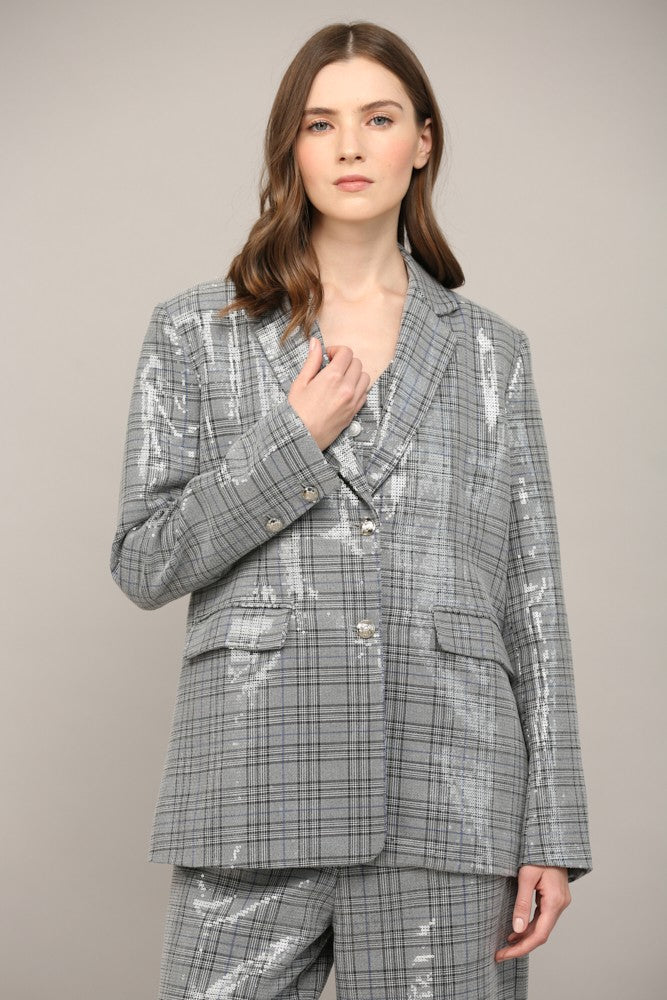Gray Plaid Sequin Embellished Oversized Blazer