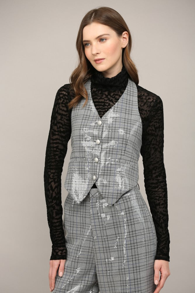 Gray Metallic Checkered Tailored Vest with Back Tie Detail