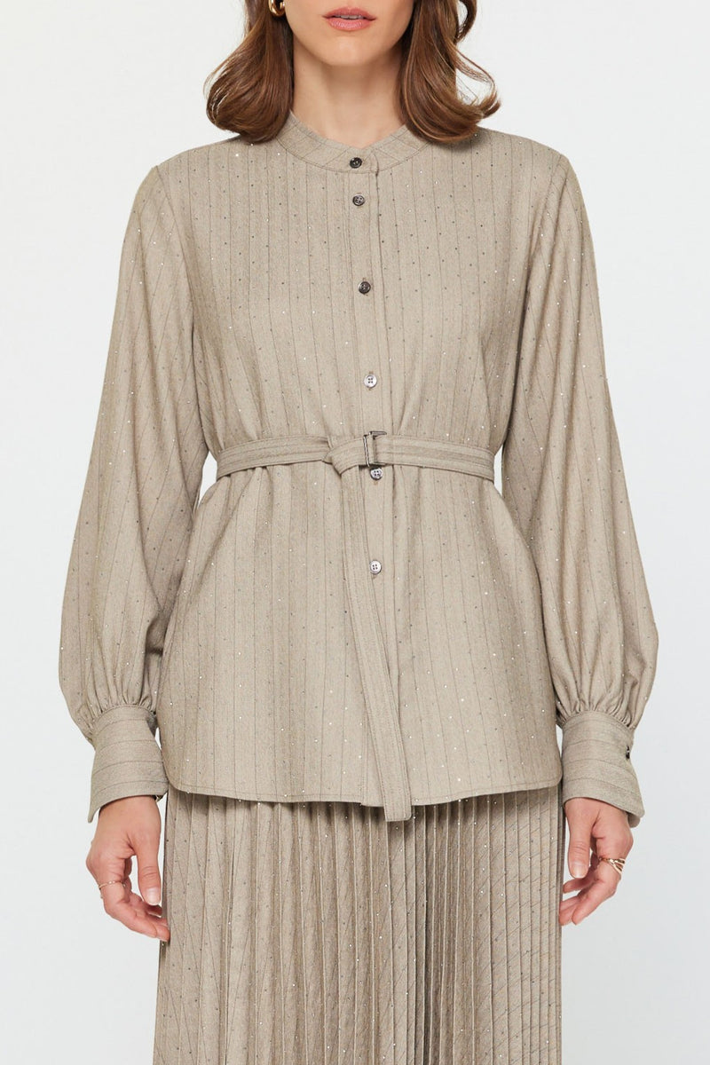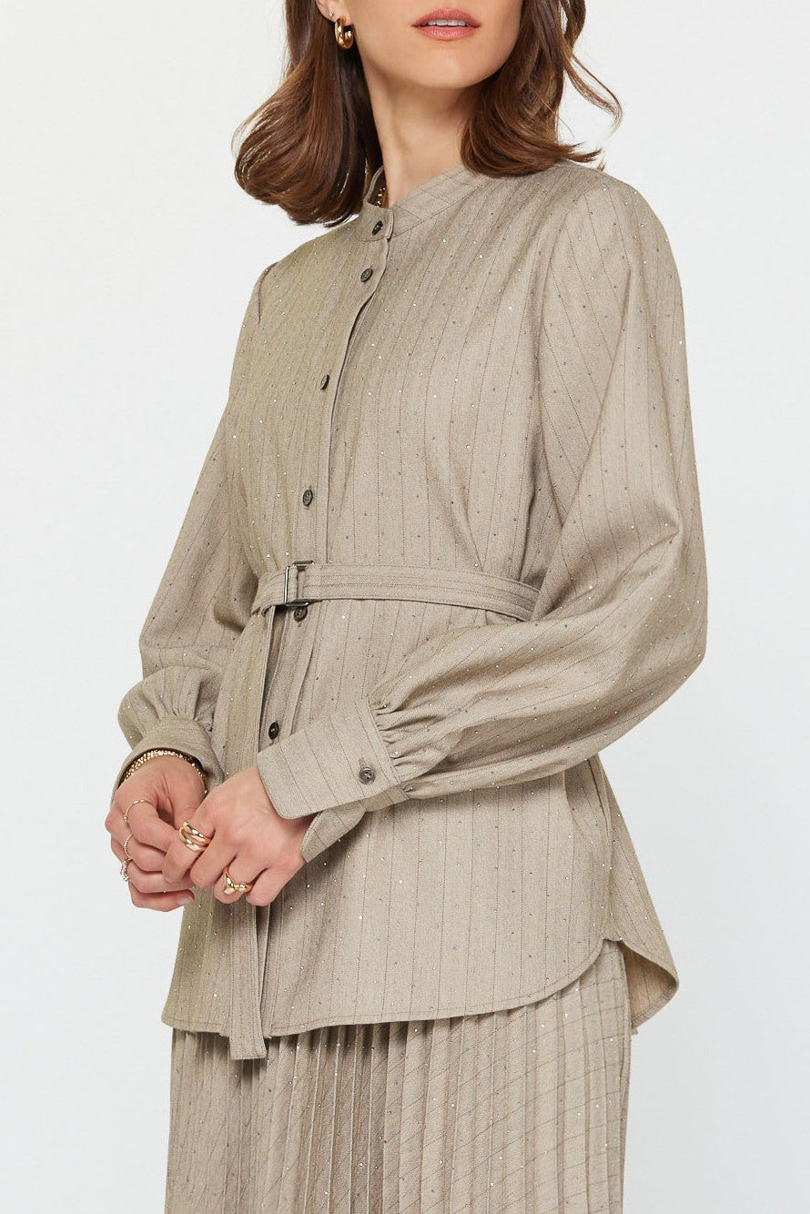Barley Belted Button-Up Blouse with Subtle Sparkle