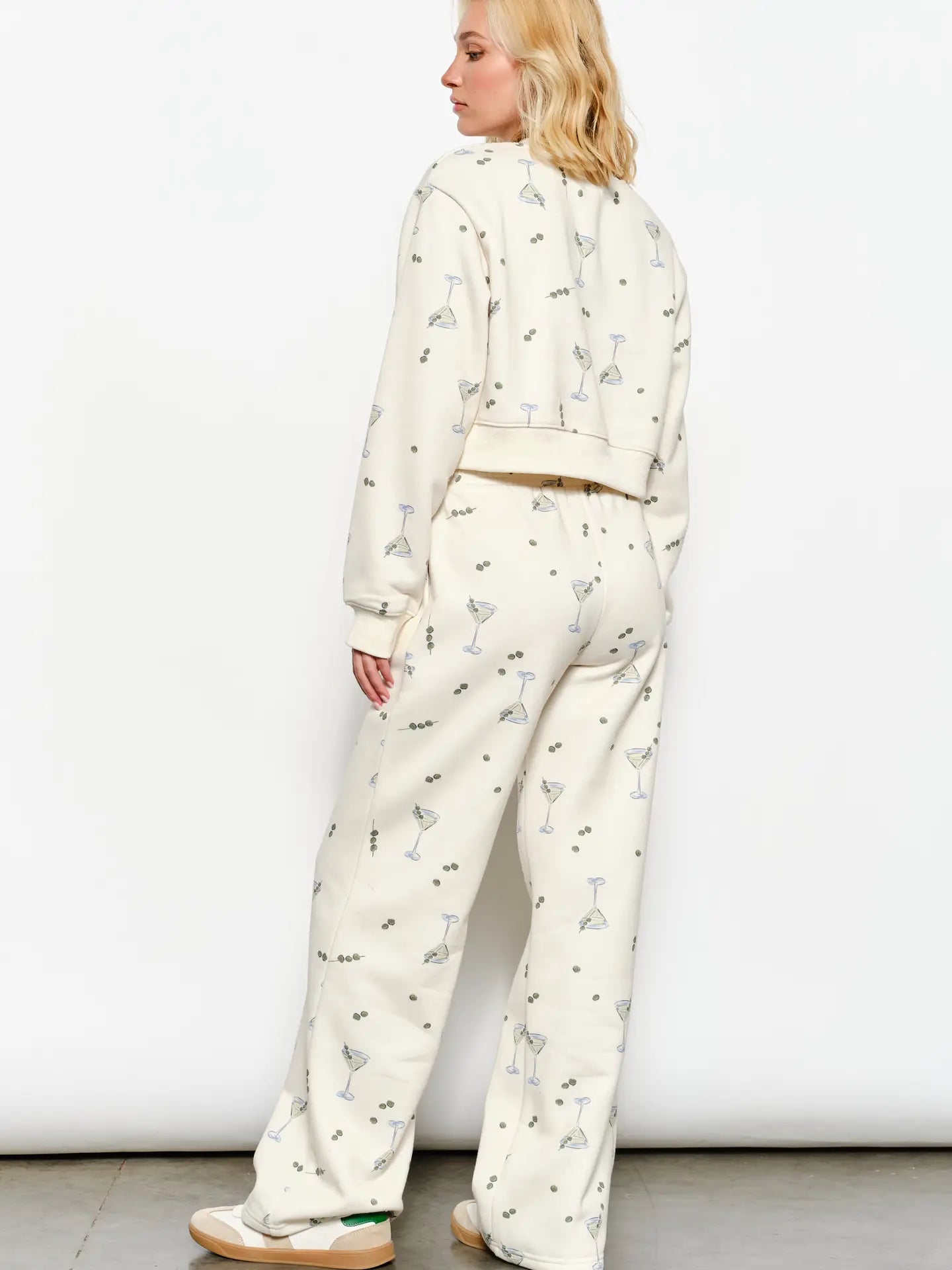 Unwind in effortless style with the Martini Print Lounge Set from Amanda Jean NYC. This cozy two-piece set features a relaxed sweatshirt and matching wide-leg pants, both adorned with a playful martini glass and olive print. Made from ultra-soft, breathable cotton-blend fabric, it’s perfect for lounging at home, running errands, or casual weekend wear. The elastic waistband and easy fit ensure all-day comfort with a touch of cheeky charm.