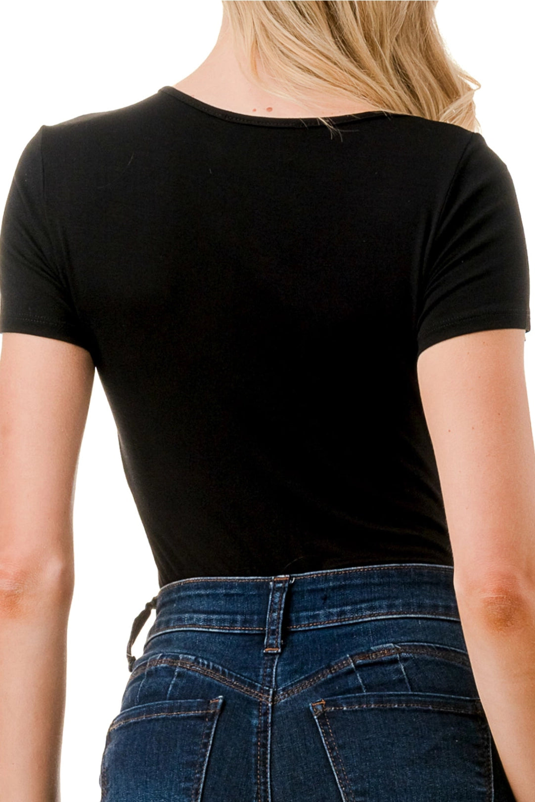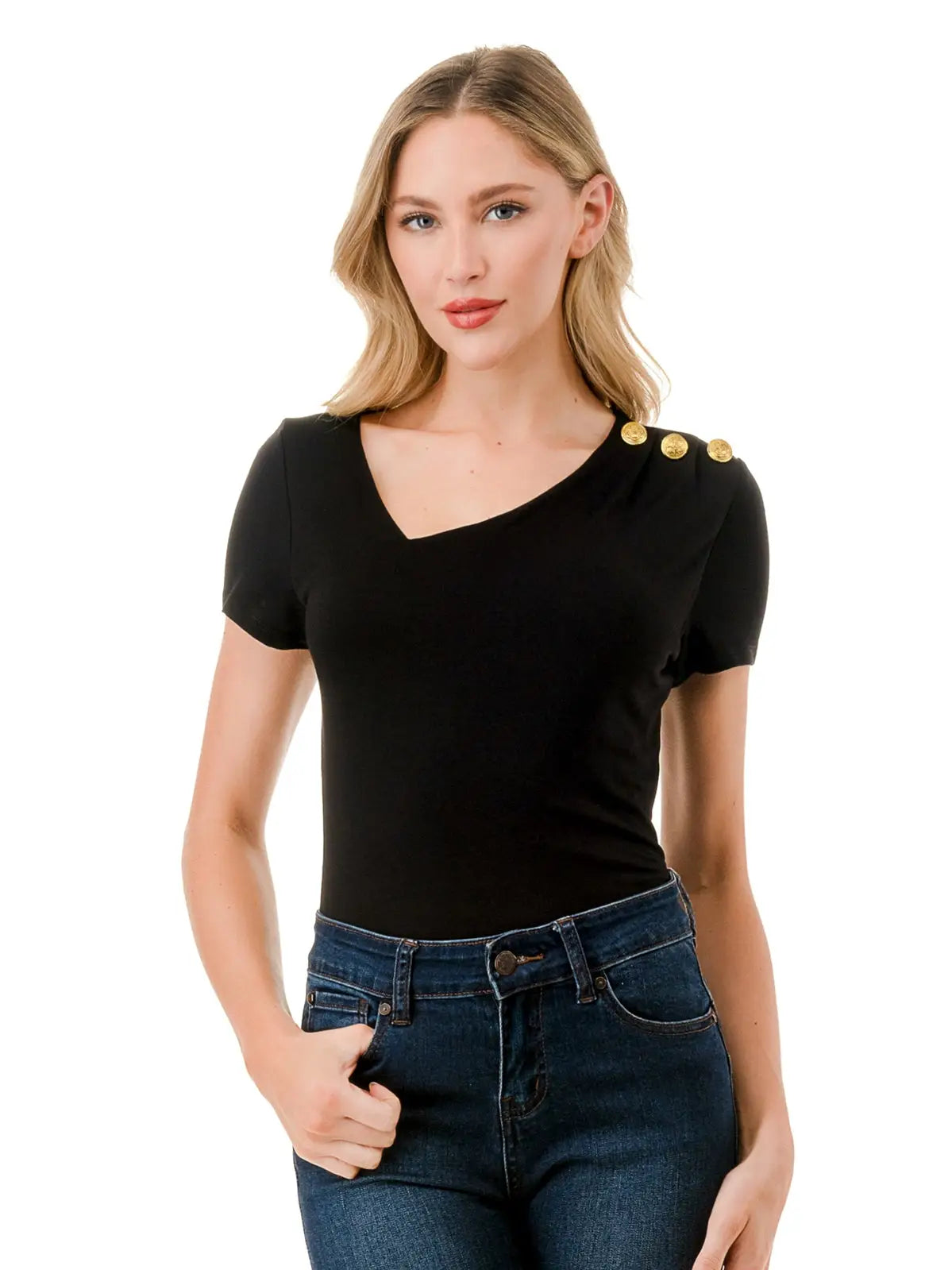 Asymmetric Neckline Black Tee with Gold Shoulder Buttons