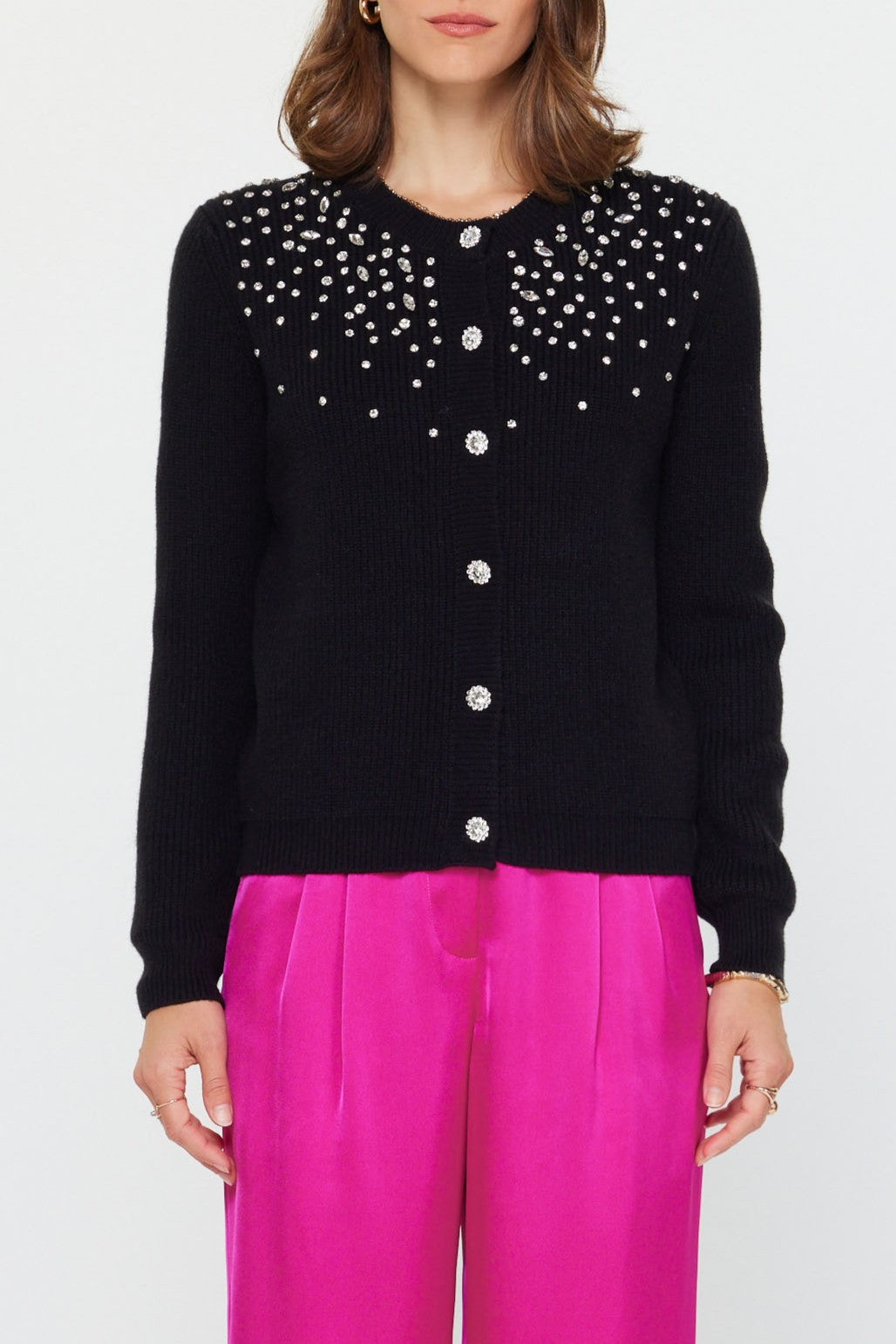 Add a touch of elegance to your everyday layers with this black crystal embellished knit cardigan from Amanda Jean NYC. Designed in a soft ribbed knit, this cardigan features sparkling crystal accents cascading across the front yoke, bringing a refined shimmer to its timeless silhouette. The classic crew neckline, long sleeves, and polished crystal buttons make it versatile enough for day-to-night transitions.