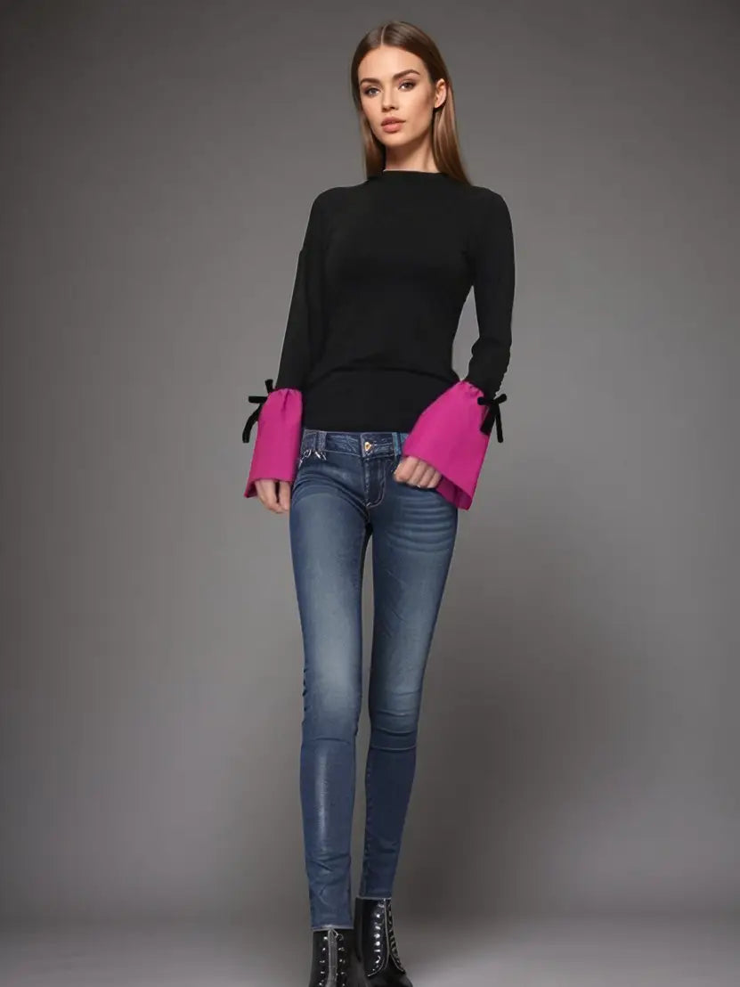 Elevate your everyday style with this striking black knit top, featuring voluminous hot pink bell sleeves cinched with delicate black bow accents. The sleek silhouette hugs the body for a flattering fit, while the dramatic sleeve design adds a bold, playful twist. This piece is the perfect fusion of minimalism and flair, making it a standout staple for both casual and dressy occasions.