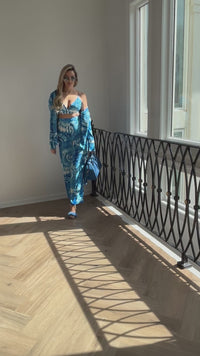 Make a statement in this bold and vibrant three-piece set from Amanda Jean NYC. Designed in a stunning blue tie-dye print, this coordinated set includes a plunge bralette top, high-waisted wide-leg pants, and a matching button-down shirt. The open shirt adds a laid-back edge, while the bralette brings just the right touch of allure. Crafted for both comfort and standout style, this set transitions seamlessly from a beach day to a summer night out.