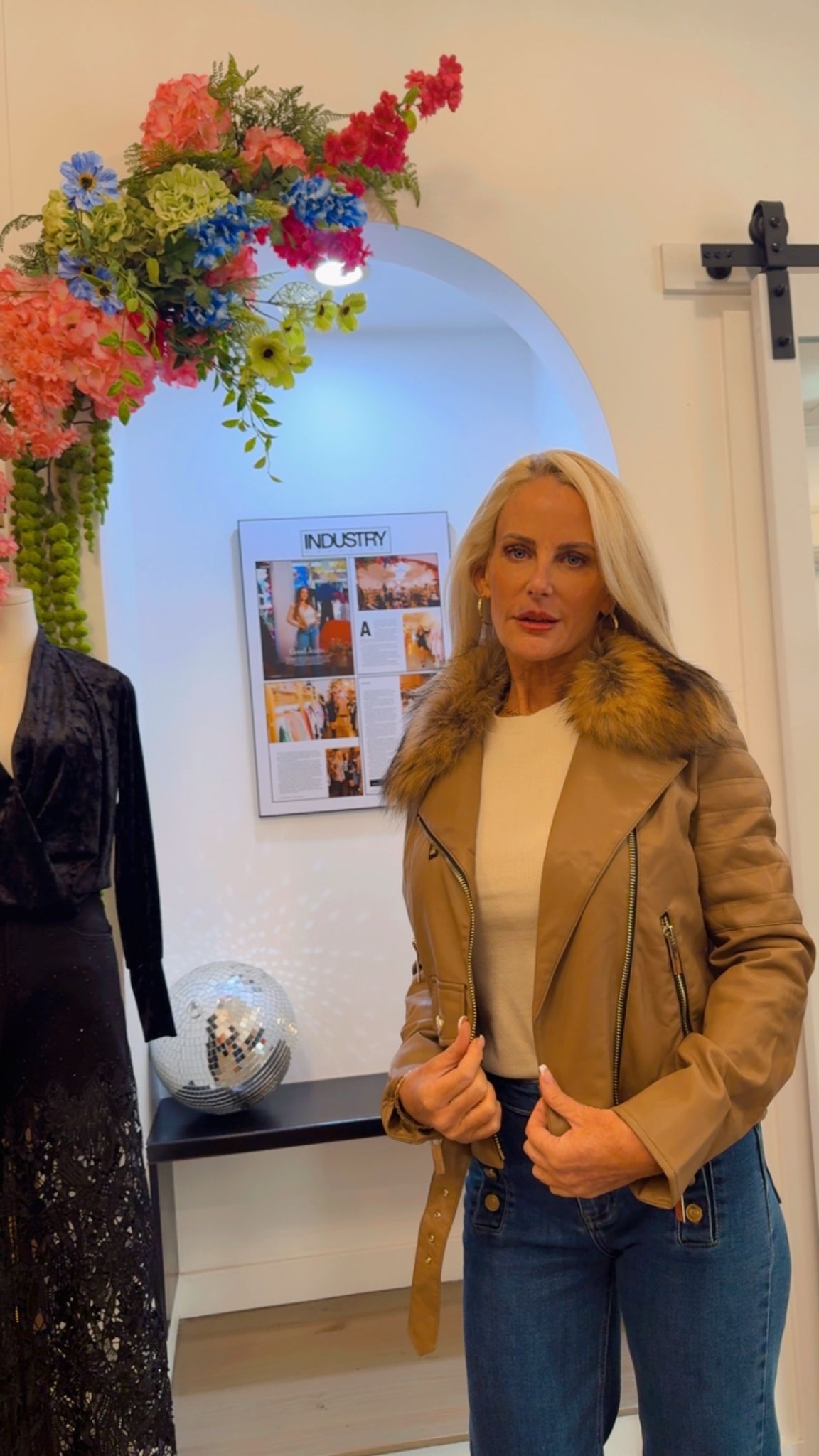 Edgy meets elegance in this striking leather moto jacket, crafted in rich camel leather and finished with a plush black-tipped fox fur collar. The belted waist and quilted sleeves add a touch of rugged luxury, while the fur detailing softens the look with refined glam.