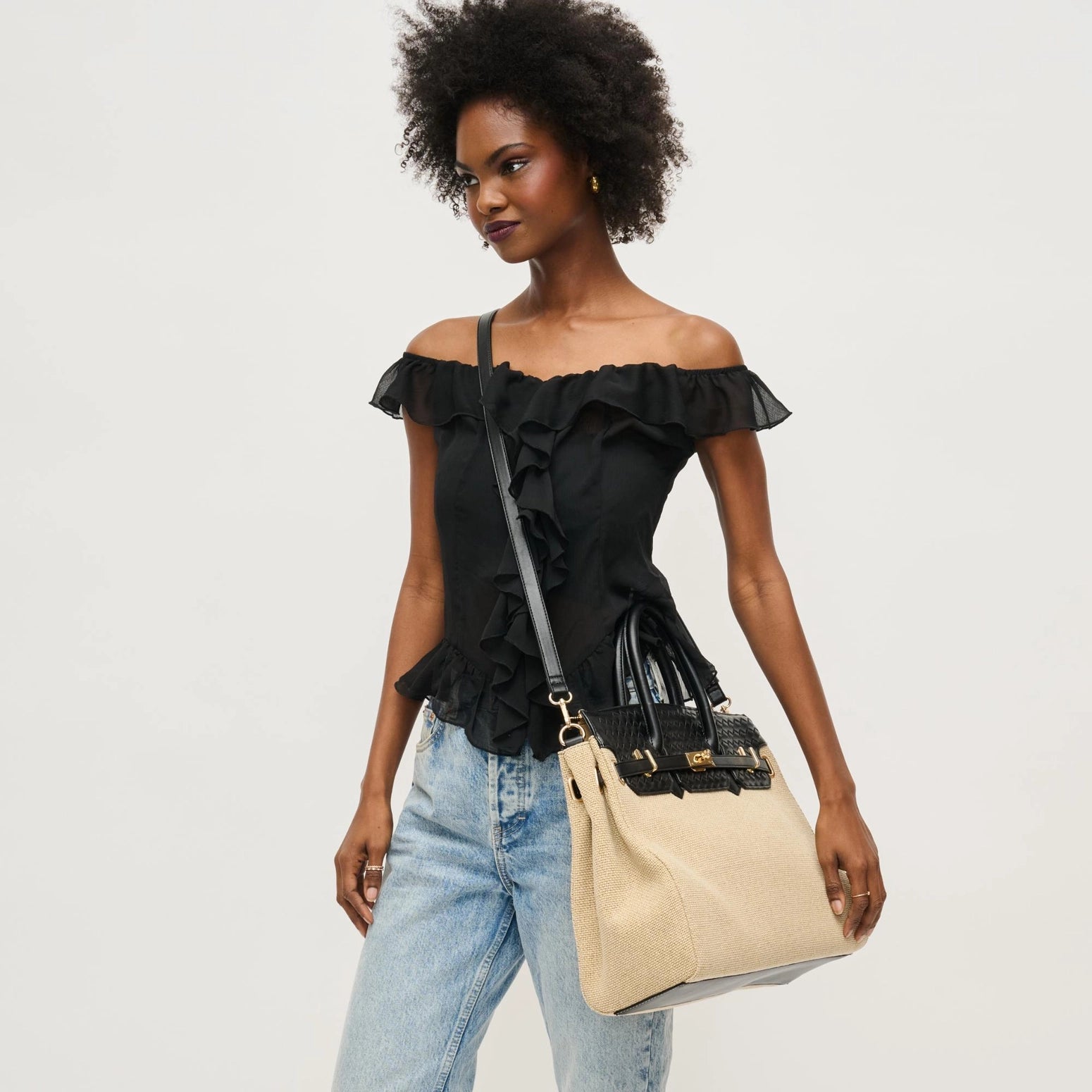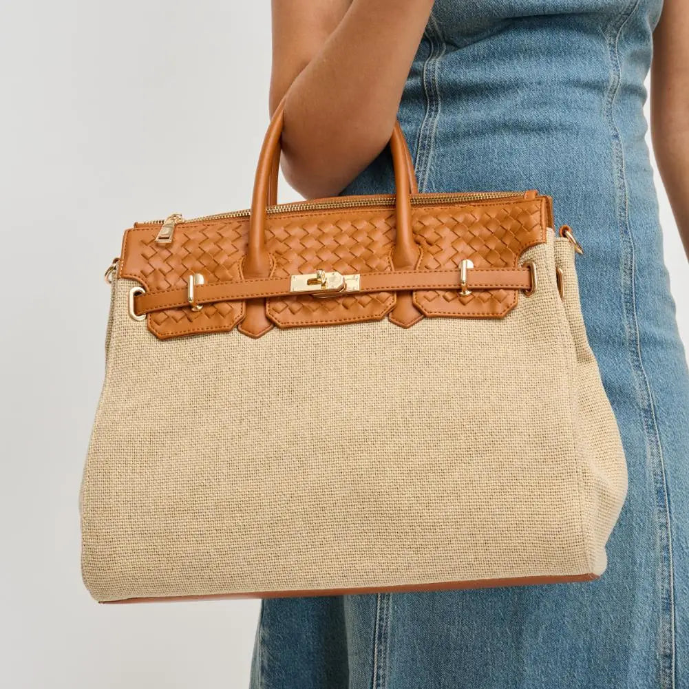 A stylish and sophisticated handbag featuring a combination of woven leather and durable canvas. The bag boasts a structured design with a top handle and a detachable shoulder strap for versatile carrying options. A decorative leather belt with gold-tone hardware adds a touch of elegance, making it perfect for both casual and formal occasions.