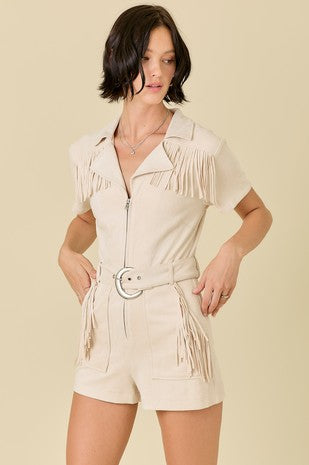FRINGE DETAIL SUEDE ROMPER WITH BELT METAL BUCKLE